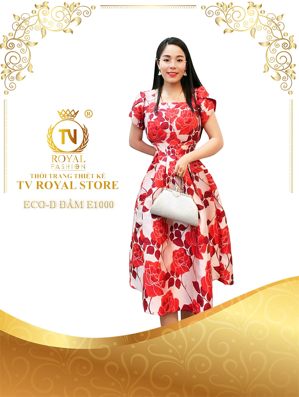 Không diêm dúa, không khoe da thịt, mẫu đầm của nhà TV Royal mang trong mình sự thanh lịch nhẹ nhàng, giống như nét duyên ngầm của phụ nữ Á Đông. Trên nền sắc hoa hồng đỏ trên nền trắng trầm tĩnh, đường nét cắt may điêu luyện, thành thục được các nhà thiết kế tài ba vẽ hình, đắp dáng, giúp các quý cô không chỉ điệu đà mà còn thướt tha với dáng vóc đồng hồ cát.