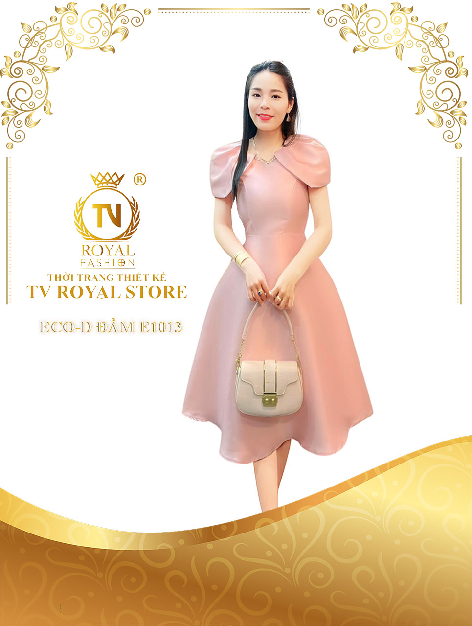 Không diêm dúa, không khoe da thịt, mẫu đầm của nhà TV Royal mang trong mình sự thanh lịch nhẹ nhàng, giống như nét duyên ngầm của phụ nữ Á Đông. Trên nền sắc vàng trầm tĩnh, đường nét cắt may điêu luyện, thành thục được các nhà thiết kế tài ba vẽ hình, đắp dáng, giúp các quý cô không chỉ điệu đà mà còn thướt tha với dáng vóc đồng hồ cát.